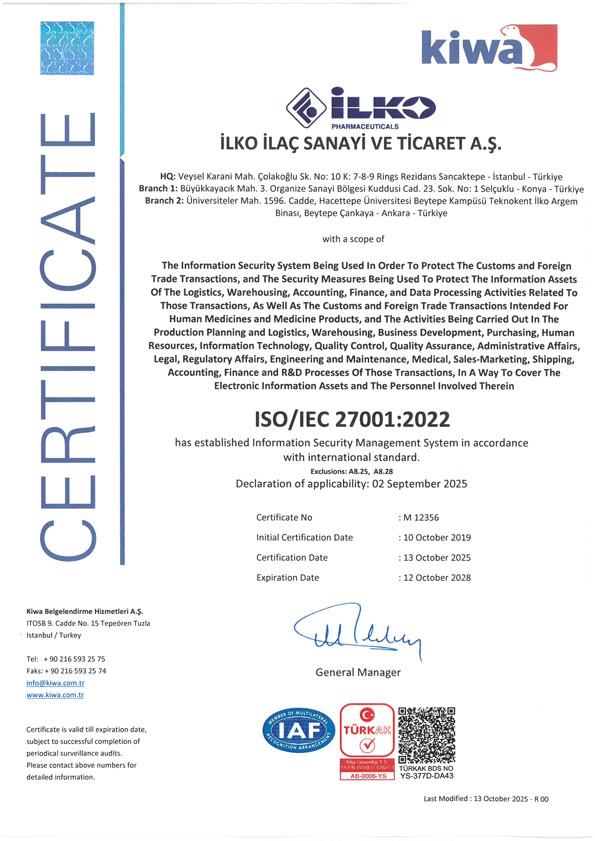 ILKO Pharmaceuticals has been entitled to receive both BS 10012 Data Protection Personal Information Management System and ISO 27001 Information Security Management System certificates that determine the confidentiality, integrity and accessibility of personal information at international standards. The latter institution has these documents in Turkey, was the first and only company in the pharmaceutical sector ILKO Pharmaceuticals.