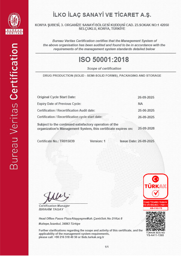 İLKO Pharmaceuticals has obtained OHSAS 18001 certification upon initiation of company operations which was originally developed by British Standards Institute and currently the standard is replaced with international occupational health and safety standard ISO 45001. İLKO Pharmaceuticals has successfully completed this transition by obtaining the ISO 45001 certification. Built on OHSAS 18001 standard, ISO 45001 Occupational Health and Safety Management System has a high-level structure established for ISO management system standards and allows for risk-based management of processes by integration into existing quality systems.