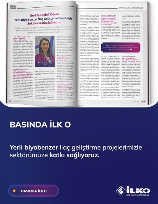 İLKO İlaç Biyoteknoloji Ar-Ge Merkezi Müdürümüz Dilan Karabulut Bıçak, WORKSHOP Dergisi'ne verdiği röportajda; İLKO ARGEM Biyoteknoloji Merkezi’mizin yerli biyobenzer ilaç geliştirme vizyonu, hücre hattından üretime uzanan entegre Ar-Ge altyapısı ve ileri teknoloji odaklı çalışmaları ile ilgili bilgiler paylaştı.